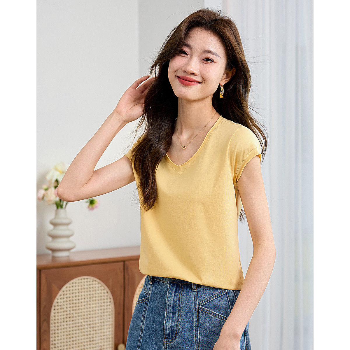 Summer yellow versatile short-sleeved t-shirt for women solid color V-neck loose short-sleeved tops for women